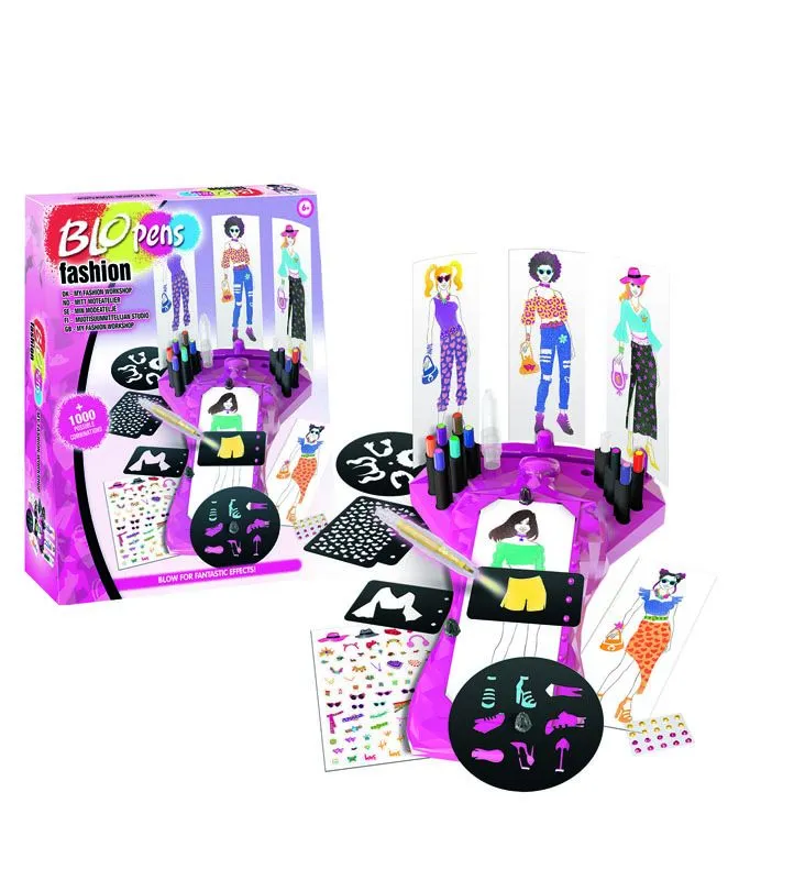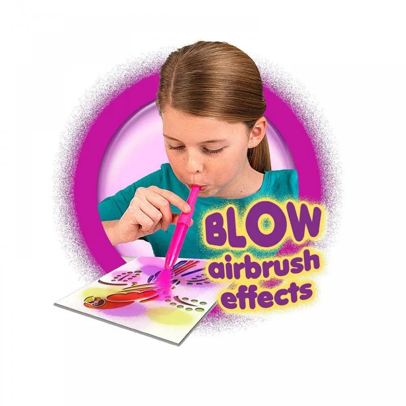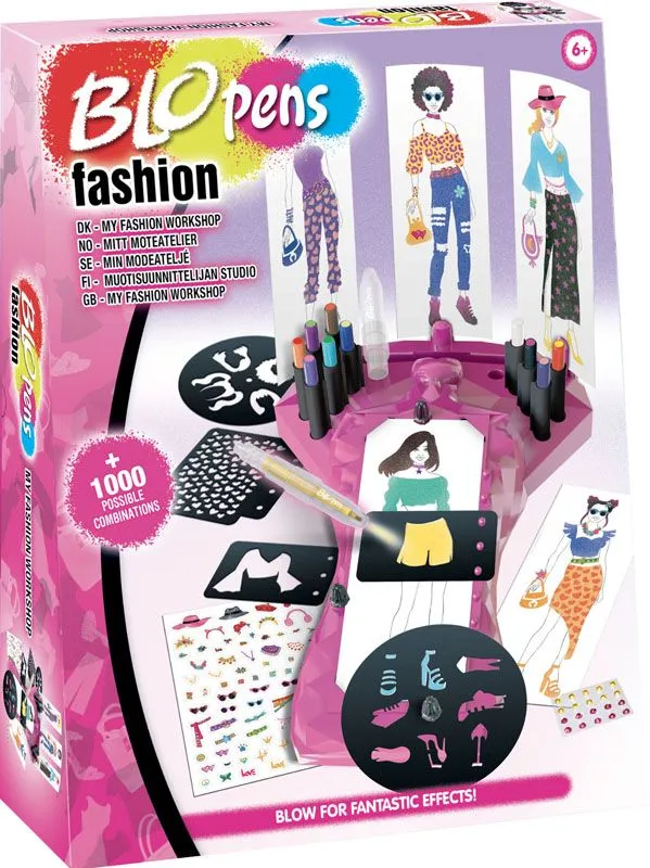 Lag dine egne design med airbrush effekt. Bruk sjablongene til å lage kule klær til modellene. Blås i Blo Pennen for å få airbrush effekt. En oppnår ulik effekt alt ettersom hvor hardt en blåser og om en beveger pennen i sirkler eller rette linjer. Pennen kan og brukes som en vanlig tusj for å sette på små detaljer. Settet inneholder: