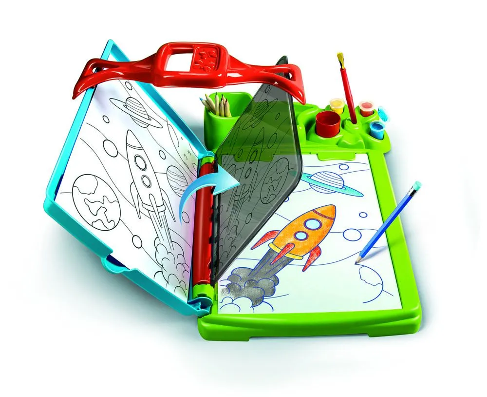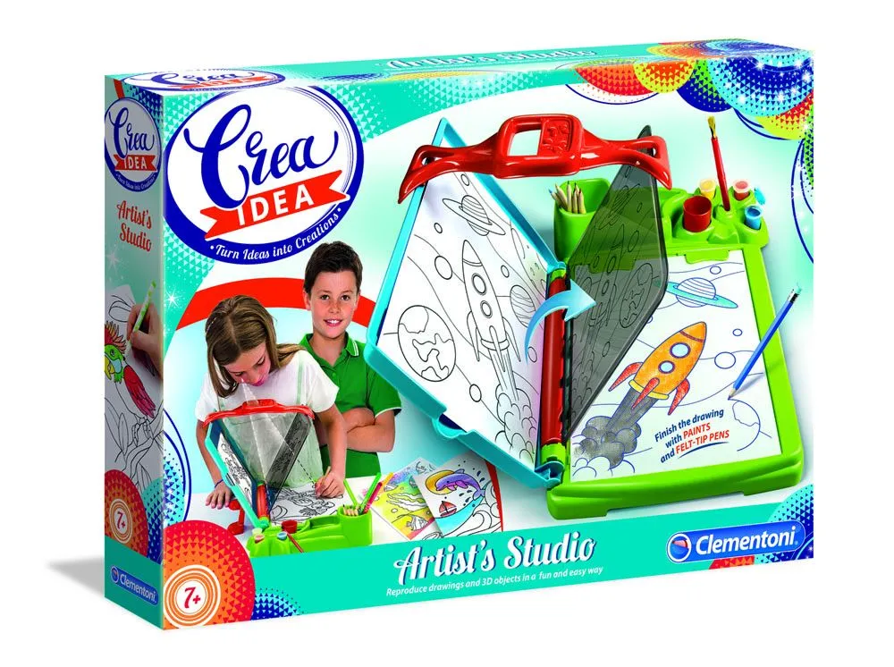 Perfekt for smÄ kunstnerspirer! Dette tegnestudio lar barnet gjenskape enhver tegning eller tredimensjonale objekt over pÄ papir. Utstyrt med forstÞrrelsesglass, mange fargeblyanter, tusjer, maling og former. Alt en trenger for Ä skape flotte kunstverk! Passer fra 7 Är+