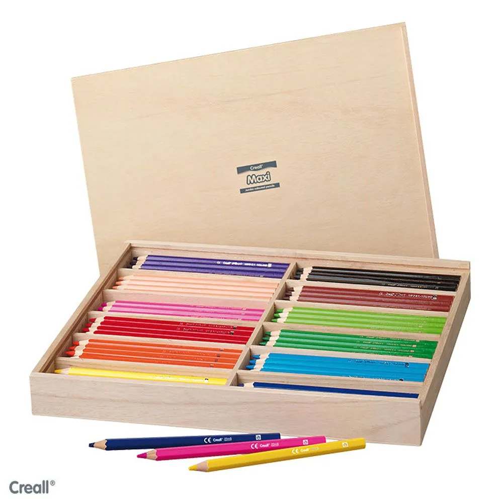 Flott og praktisk eske i tre som inneholder hele 144 fargeblyanter av god kvalitet utviklet spesielt for barn. Settet kommer i 12 forskjellige lyse, fine farger, hver farge med 12 fargestifter. Tykkelsen på fargeblyantene er 5 mm. Anbefalt alder fra 3 år.