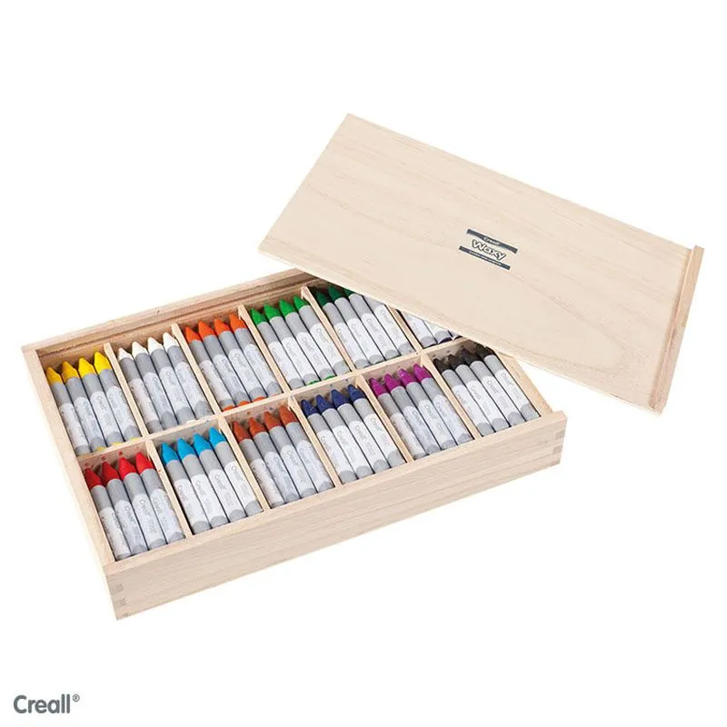Flott og praktisk eske i tre som inneholder hele 144 voksfargestifter i lyse fine farger. Settet kommer i 12 forskjellige farger, hver farge med 12 fargestifter. Tykkelsen på fargestiftene er 12 mm.
