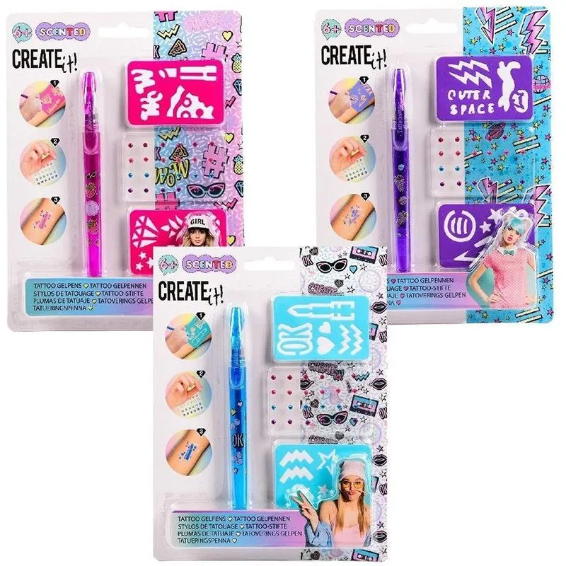 Lag dine egne tatoveringer med dette stilige settet fra Create It! Bruk de små sjablongene som følger med og tegn inni, eller bruk din egen fantasi for å tegne den tatoveringen du ønsker. Når du har tegnet ferdig kan du dekorere med de flotte diamantene. Gelpennen kommer med en deilig duft! Settet kommer i 3 forskjellige variasjoner og blir plukket ut tilfeldig når du bestiller på nett.