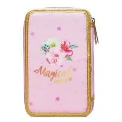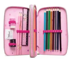 Stilig dobbel pennal med motiv av en enhjørning. Inni pennalet finner du 16 fargeblyanter, 2 blyanter, linjal, viskelær, blyantspisser og en notatblokk.