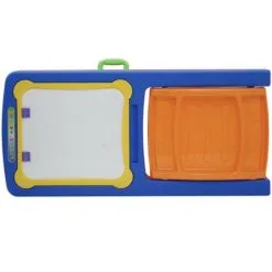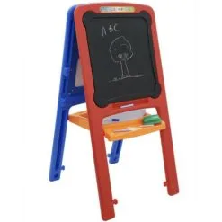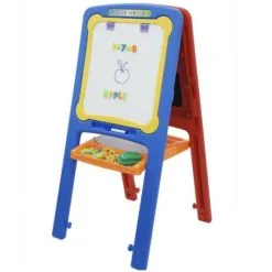 Dobbeltsidig tavle på bein. Den ene siden består av et magnetiske hvitt brett, mens den andre består av krittbrett og malebrett. Inkluderer 84 magneter, 6 stk farget kritt, 5 ark eller tegnepapir, en tavlemarkør og et viskelær, vil de små aldri gå tom for måter å uttrykke kreativitet på.