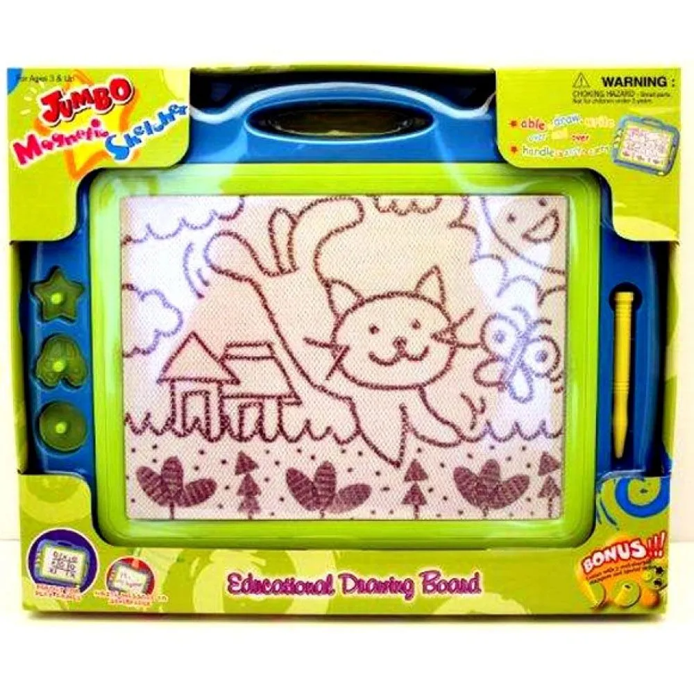 Stor evighetstavle som barna kan tegne på om og om igjen. De bruker magnetpennen til å tegne på brettet, og kan dekorere med de medfølgende stemplene, så kan de enkelt viske ut igjen når de vil begynne på nytt. Evighetstavlen har et praktisk håndtak og fester til penn og stempler så den er enkel å flytte på og ta med seg.