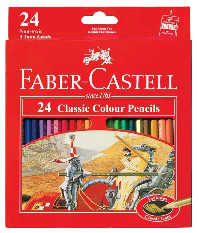 Klassiske fargeblyanter fra kvalitetsmerket Faber Castell! Pakken inneholder 1 blyantspisser og 24 stykk fargeblyanter, inkludert fargen Gull. Blyantene er laget av økologisk produsert tre. Esken mÃ¥ler: ca 18cm x 18cm.Â
