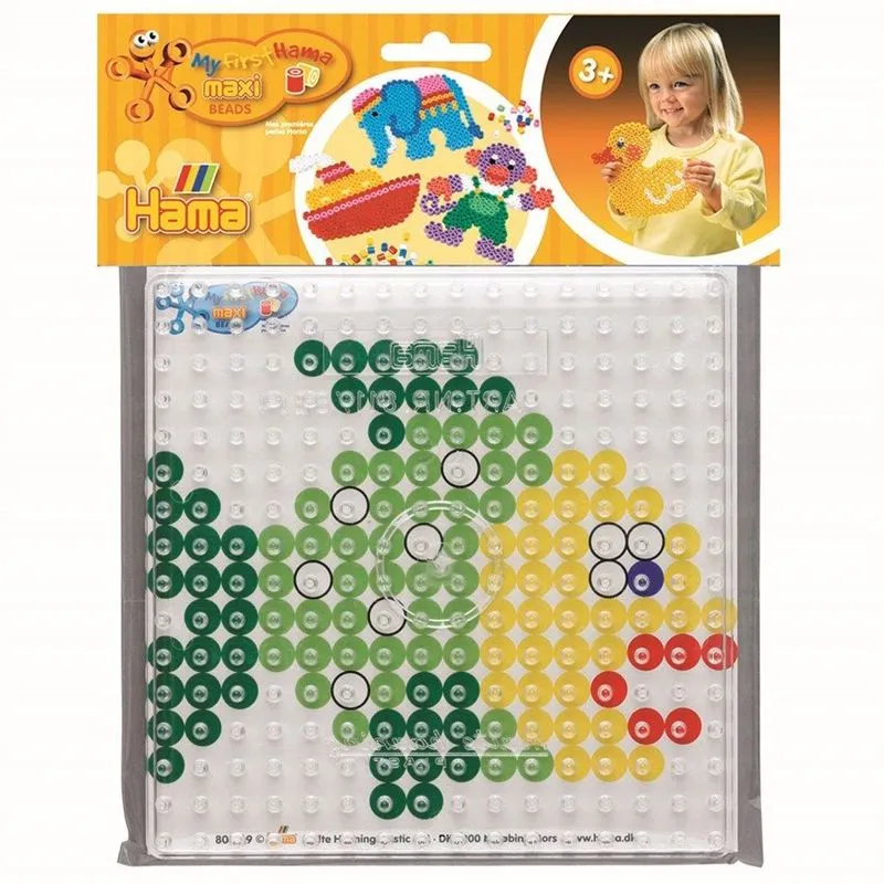 Barna kan bruke fantasien og lage flotte, fargerike mønstre og figurer på dette store, kvadratiske Hama perlebrettet. Brettet passer til Hama Maxi perler (selges separat).