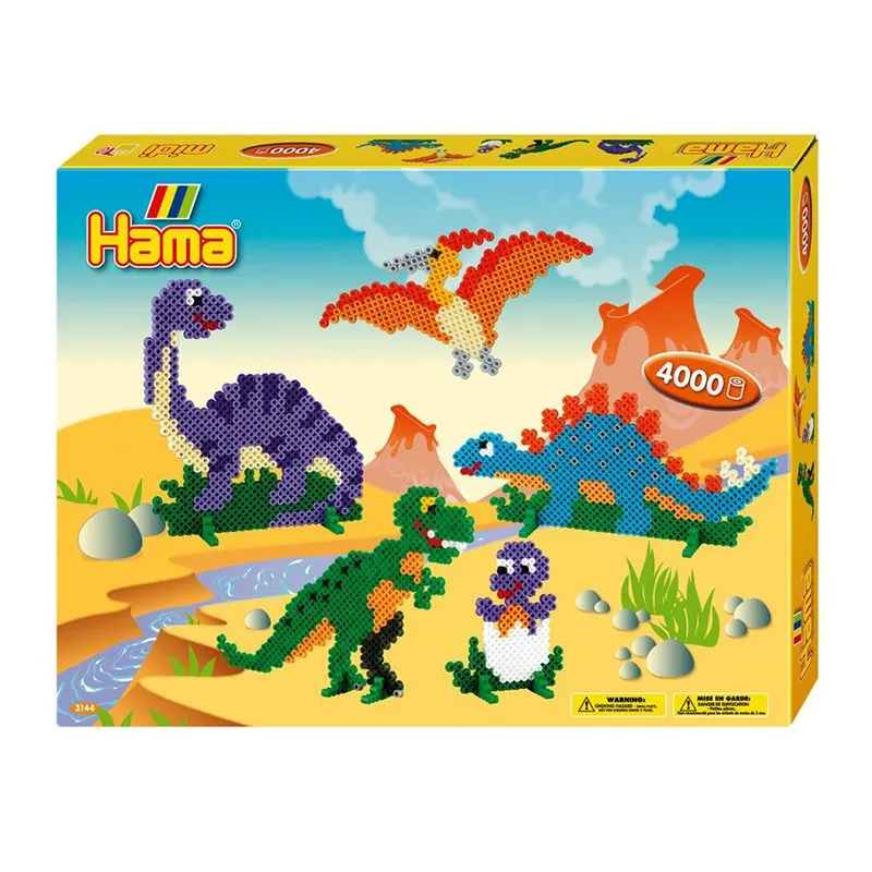 Flott Hama Midi gaveeske med 4000 perler i ulike farger, 2 store kvadratiske perlebrett og motivark som viser hvordan en perler kule dinosaurer. Inkludert er også veiledning og strykepapir.