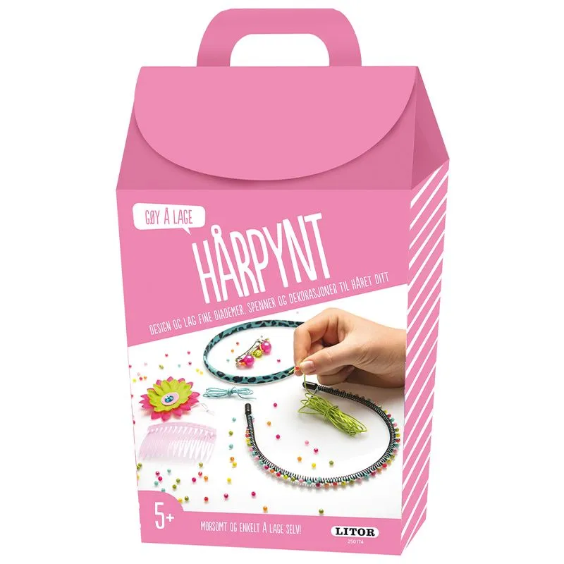 Lag din egen hårpynt som hårbøyle, spenne, og kam, dekorert med fargerike perler med dette morsomme hobbysettet. Hårpnten er morsom og enkel å lage selv. Esken inneholder:
