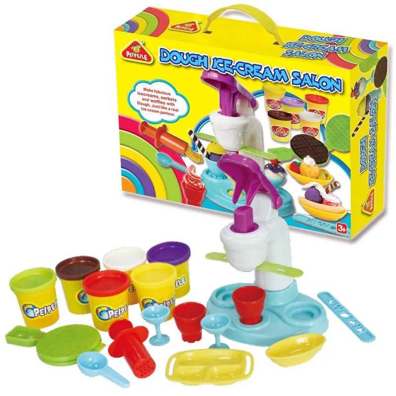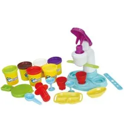 Lag flotte og morsomme iskremdesserter med lekeleire i ulike farger! Dette Iskrem settet inneholder iskremmaskin hvor du kan trykke ut leiren i ulike former, flere serveringsglass, lekeleire i sterke farger og mye tilbehør. Perfekt til kreativ lek igjen og igjen.