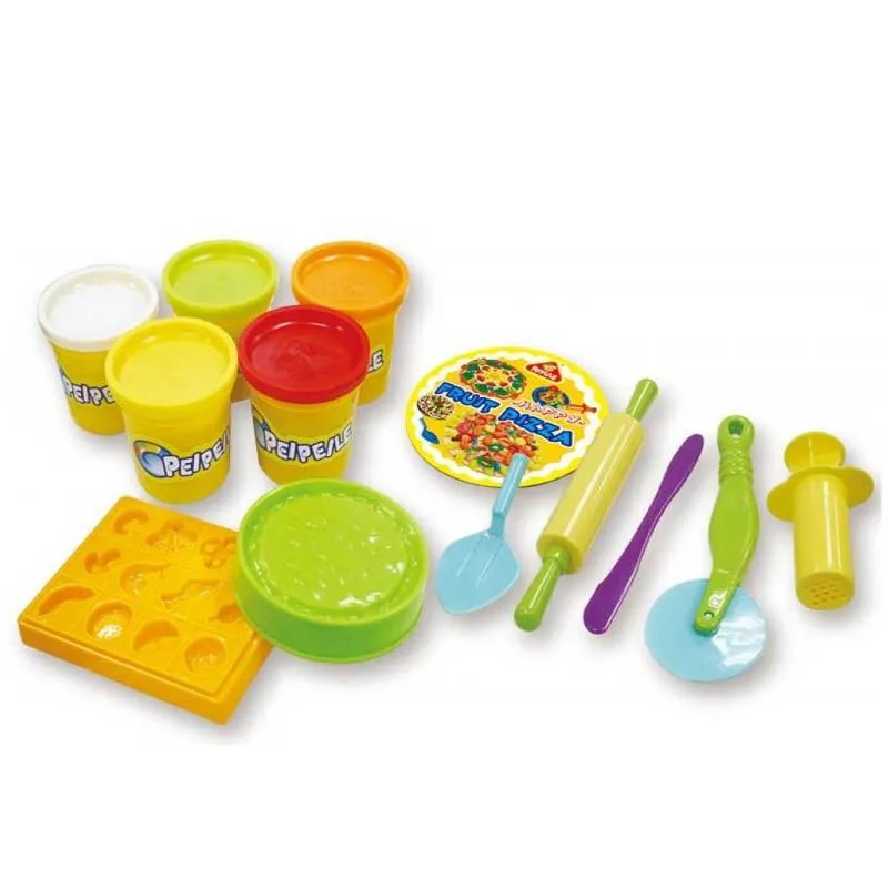 Barna kan kutte, forme og lage sin egen morsomme pizza i lekeleire! Dette settet inneholder alt barna trenger for å lage sin egen lekepizza. Med 5 bokser fargerik lekeleire, brett med former, kjevle, pizzahjul og annet tilbehør kan barna leke og skape igjen og igjen.