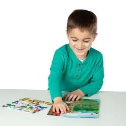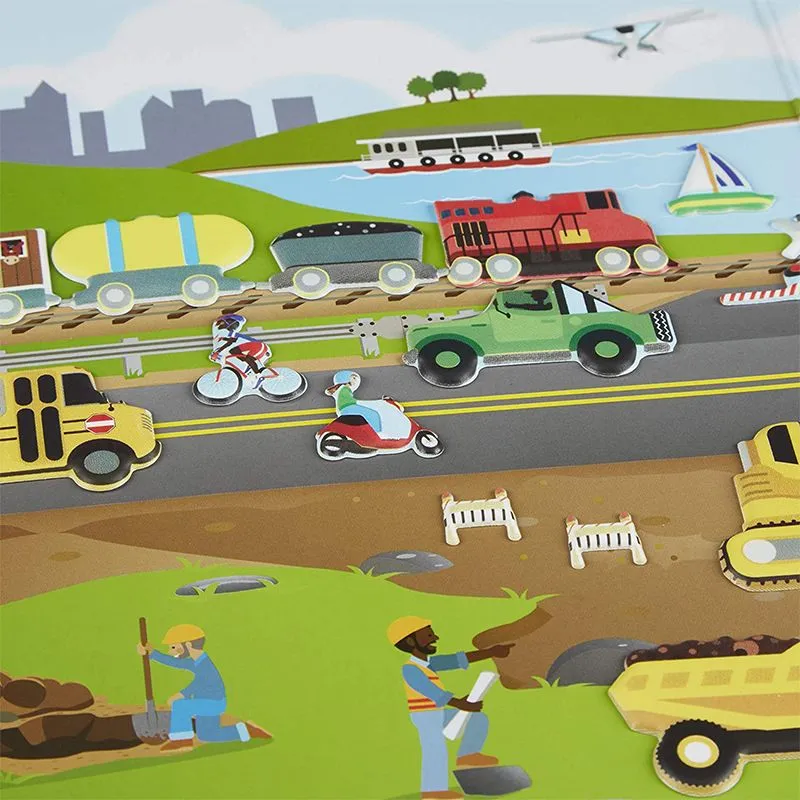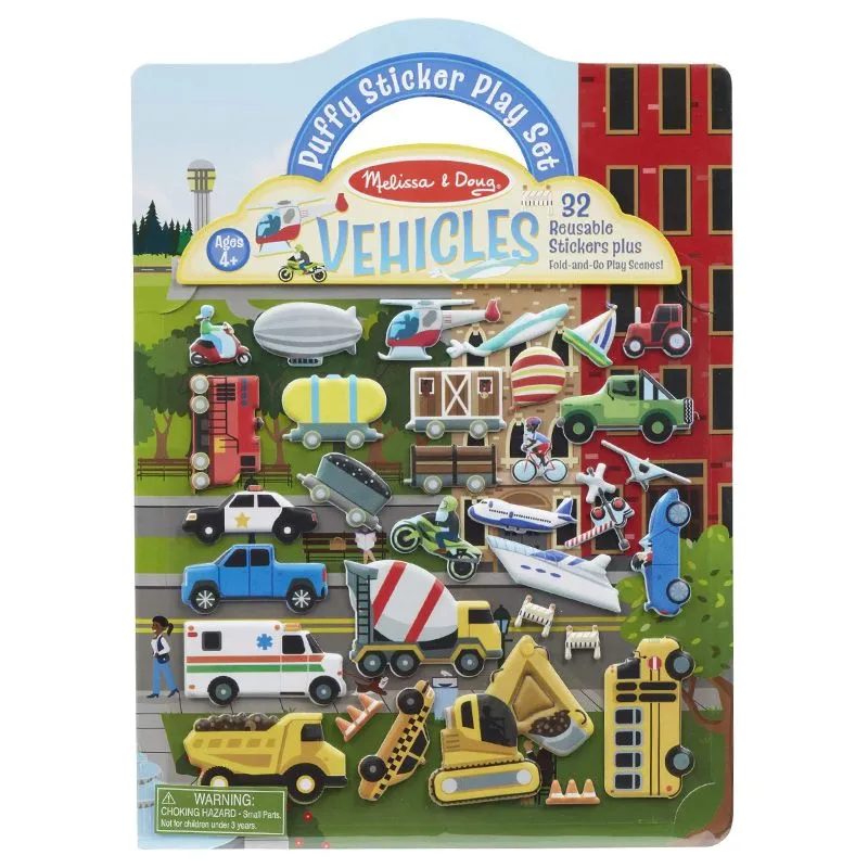Med denne stilige puffy gjenbruk klistermerkesamlingen fra Melissa & Doug, kan du flytte rundt på kjøretøyene så mye du vil! Flytt de stilige kjøretøyene rundt på brettet og skap din egen morsomme fortelling. Den gule bussen kjører gjennom byen og traktoren er opptatt på gården. Bruk av gjenbruks klistermerkene er med på å utvikle barnets finmotorikk, hånd/øye kontakt, kreativitet og rollelek. Brettet kommer med et praktisk håndtak og er lett å ta med seg.