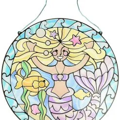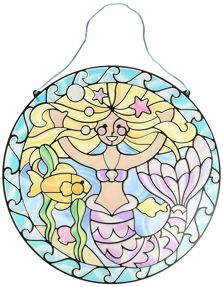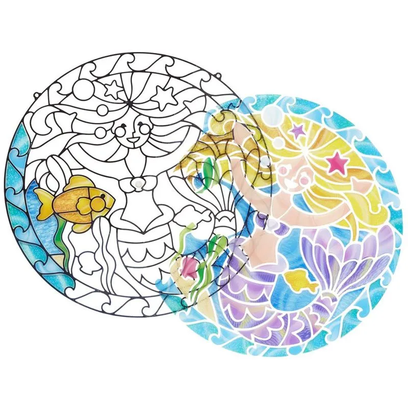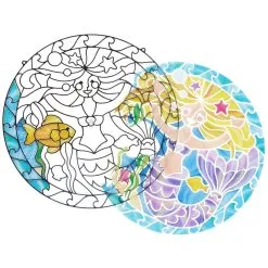 Dette kunst og håndverk settet gir unge kunstnere alt de trenger for å lage skinnende glassmaleri av en havfrue i havet. Resultatet blir nydelig. Heng det ferdige kunstverket i et solfylt vindu og se nydelige scener utspille seg. Det er enkelt å lage; bare sett sammen klistrene til riktig nummer og sett dem på det gjennomsiktige glasset.