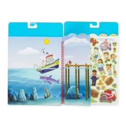 - Hver Flip-Flap-scene har et ark med koordinerende gjenopprettbare klistremerker som lagres i den spiralbundne puten.