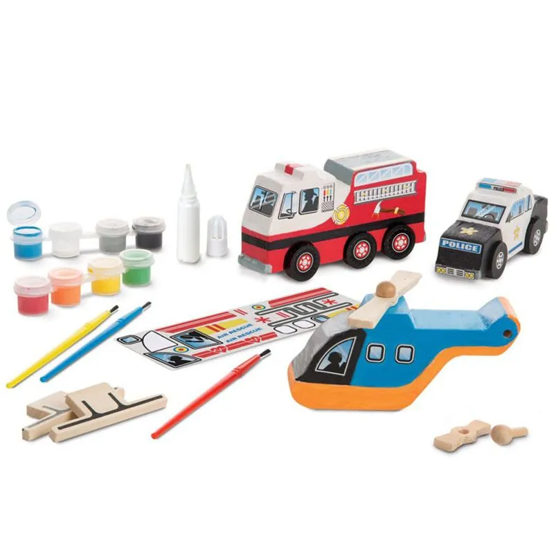 Spennende redningskjøretøy sett med tre redningsbiler fra Melissa & Doug. Hjul og propeller kan spinne! Settet er lett og montere og inneholder politibil, brannbil og helikopter i tre, hjul, aksler, propellere og stativ, pluss 8 potter med maling, 3 pensler, lim og mange tema klistremerker for å fullføre utseendet. Barna kan dekorere og vise dem alle eller lage dem sammen med venner – en morsom aktivitet.