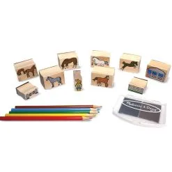 Med dette stempelsettet med åtte ulike hestestempler, stempelpute med to farger og fargeblyanter kan både små og store dekorere og fargelegge. Alt har sin plass i den praktiske treboksen når pyntingen er ferdig.