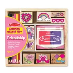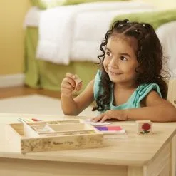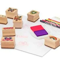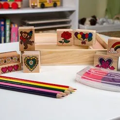 Med dette stempelsettet med åtte ulike stempler, stempelpute med to farger og fargeblyanter kan både små og store dekorere og fargelegge. Alt har sin plass i den praktiske treboksen når pyntingen er ferdig.
