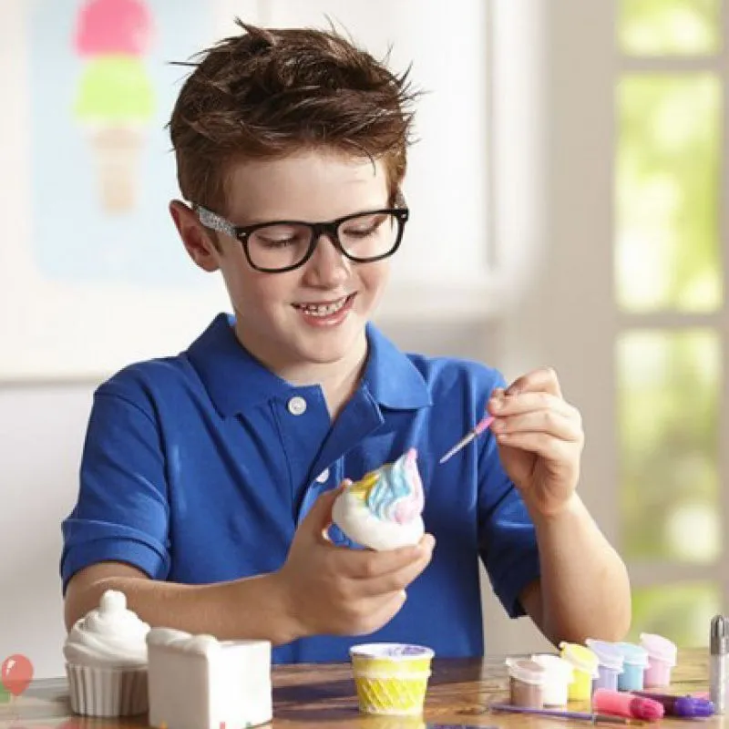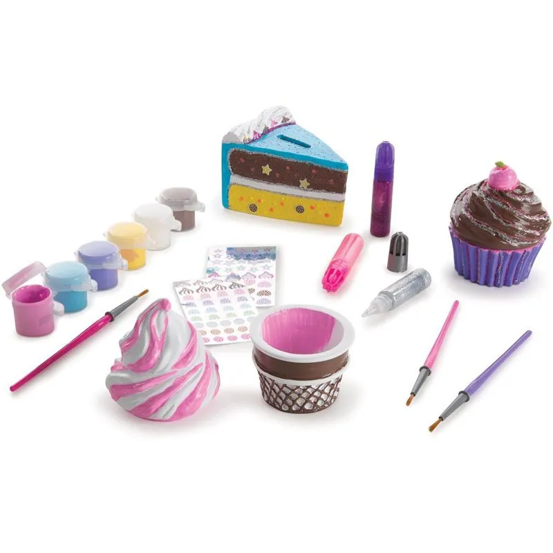Inneholder 2 muffin smykkeskrin, 1 kake sparebøsse, maling, pensler, glitter og klistremerker.