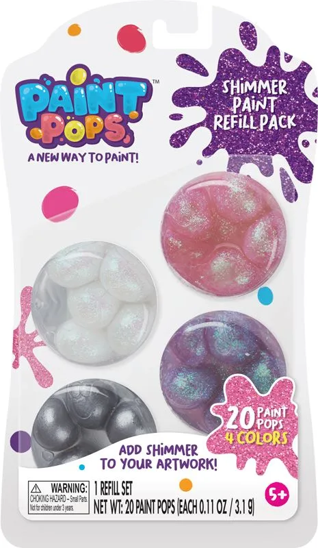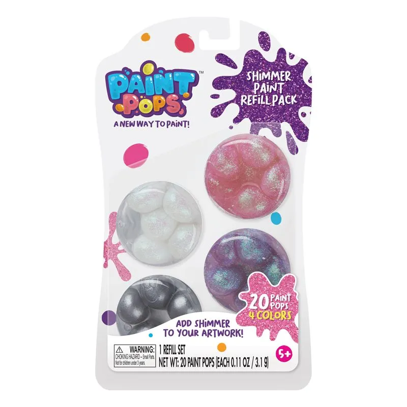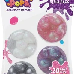 Slipp løs din indre artist! Paint Pops er en ny måte å male på. En liten klatt maling i en myk ball som du kan sprute med fingrene dine eller med et Paint Pop-verktøy. Lag tilfeldige, abstrakte bilder med pop-verktøyene, eller lag mer detaljerte design med pop-pennen. Etterpå kan du legge til morsomme effekter med rullen eller skrapen – eller stemple rundt mesterverket ditt med stemplene. Verktøyene er enkle å rengjøre i vann. Fra 5 år.