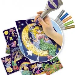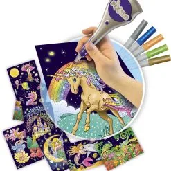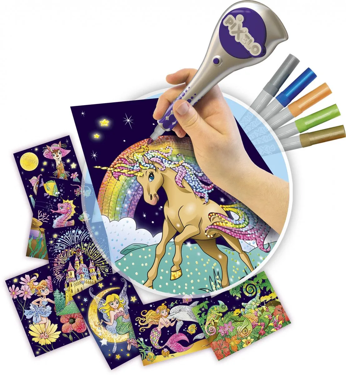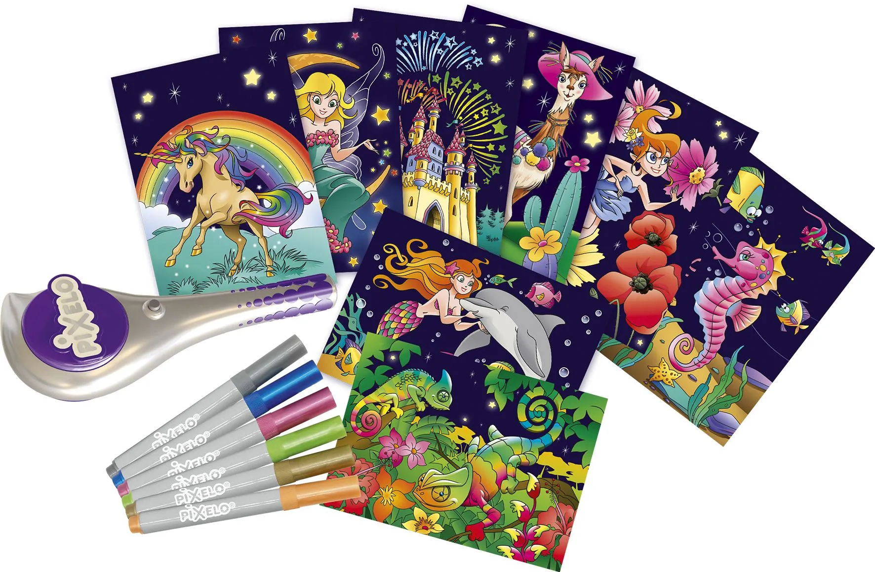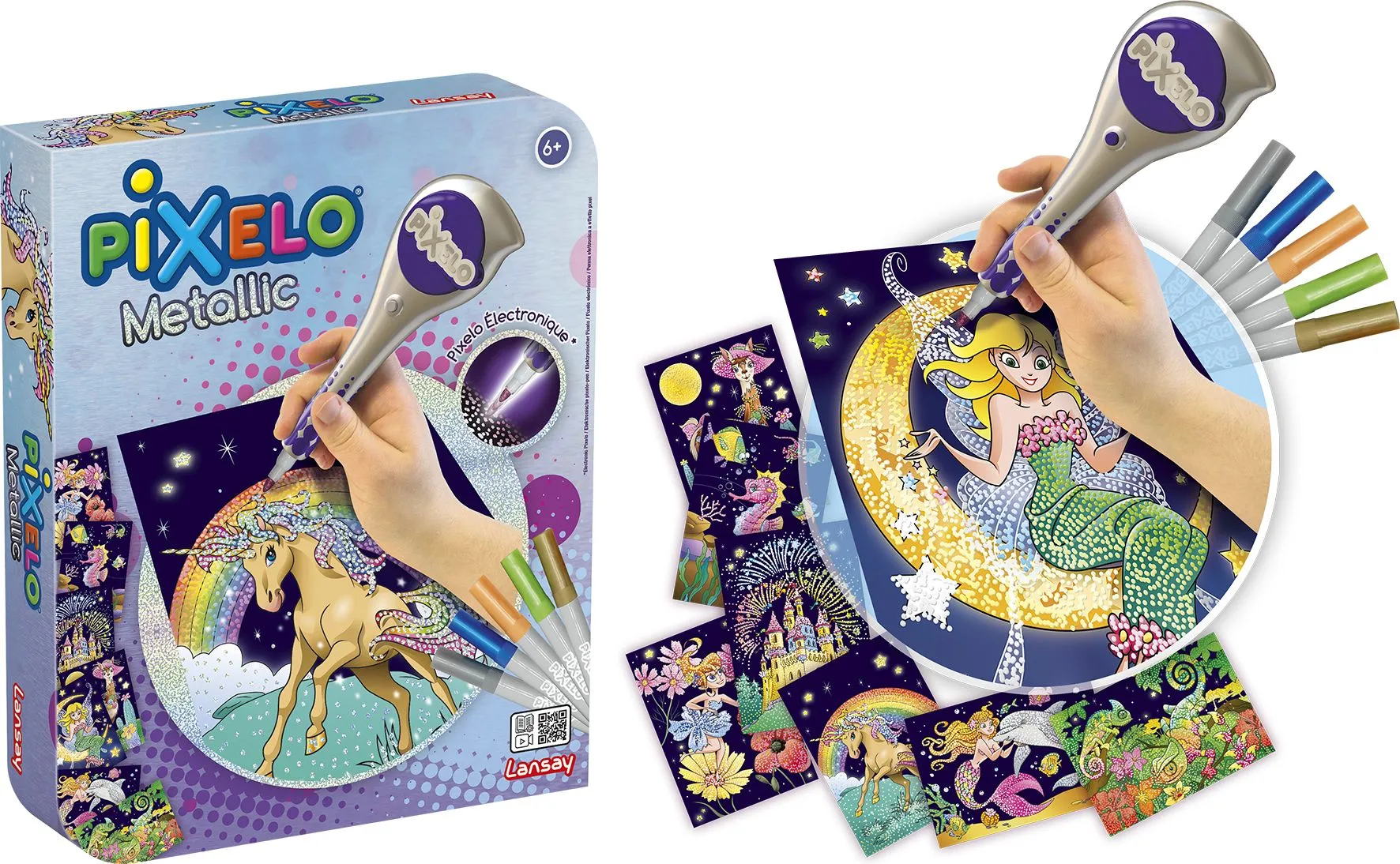 Lag vakre, fargerike design på et øyeblikk med den elektroniske Pixelo-pennen. Velg din illustrasjon og bruk din elektroniske Pixelo til å lage metalliske stiplede mønstre. Du kan også bruke markøren på den klassiske måten for å fullføre tegningen. Pixelo Metallic penn lager hurtig dotte-effekter og kommer med 8 nydelige illustrasjoner trykket på sort papir slik at de metalliske effektene virkelig kan skinne. Fargene på tegningen din vil gradvis avsløre seg foran øynene dine!