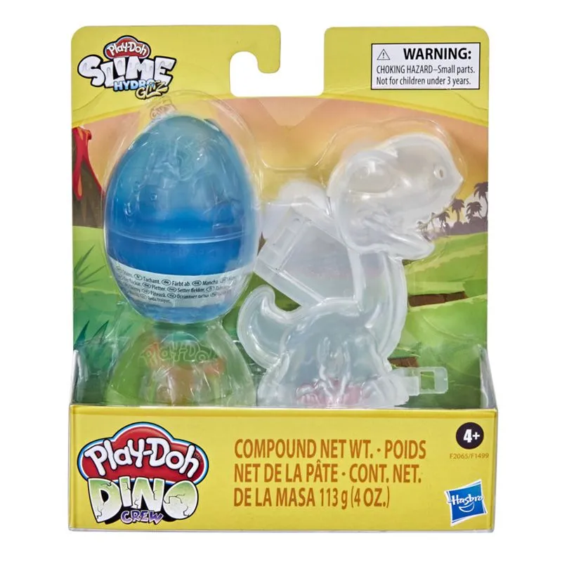 Grav deg inn i moroa og lag din egen dinosaur med Play-Doh Dino Crew dinosaureggene! Hvert egg er fylt med det glatte Play-DohHydroGlitz slimet og dinosaurskjelett. Sett sammen skjelettet og fyll dinosaur formen med HydroGlitz slimet for å lage din egen brontosaur!