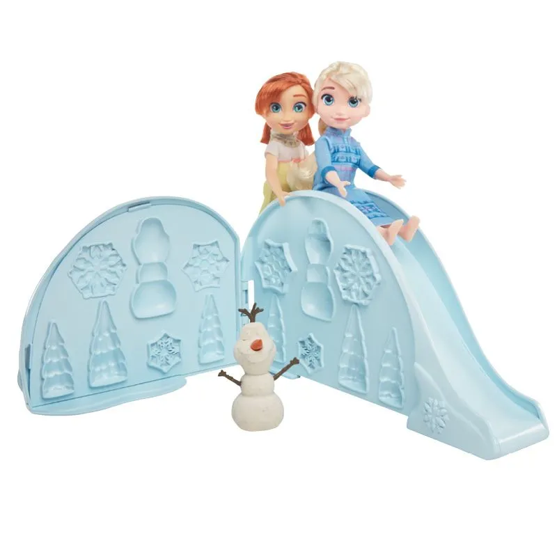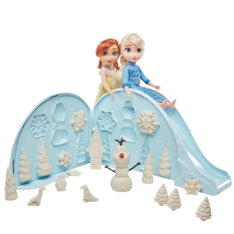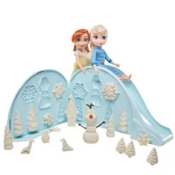 Barn fra 3 år vil elske å gjenskape det artige filmøyeblikket med dette lekesettet med motedukker og Play-Doh. Bruk den hvite 84 g boksen med giftfri hvit Play-Doh Sparkle-modellermasse for å tilføre glitter til den kreative leken. Sklien med to sider er full av artige overraskelser. Én side har en sklie begge dukkene kan rutsje ned, og den andre siden har 15 former for å lage snøfnugg, trær og til og med Olaf. Ikke glem å fullføre utseende med plastpinnene og gulrotnesen! Samle på andre Disney Frozen-dukker og -lekesett (hver selges separat) for å gjenskape favorittscenene med karakterer barna kjenner og elsker.