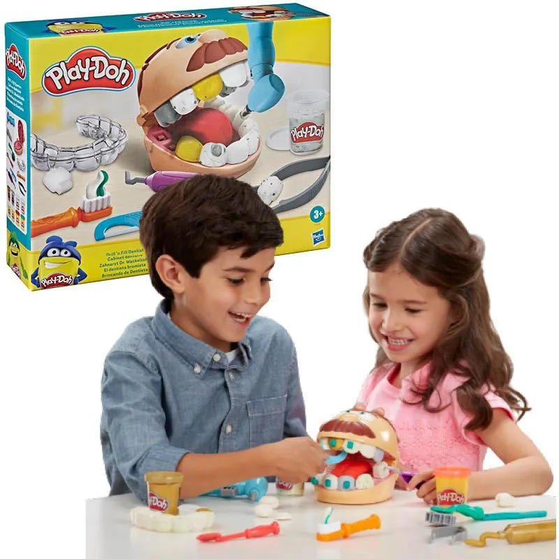 Hulromsfarget modelleringsmasse har grønne flekker for å se ut som pasienten har gunk i tennene, og gull og sølv Play-Doh-farger gir flotte seler og fyllinger. Med totalt 10 leketøy-tannlegeverktøy og 8 giftfrie Play-Doh-bokser, er dette leketannsettet en flott aktivitet eller gave til barn fra 3 år og oppover!