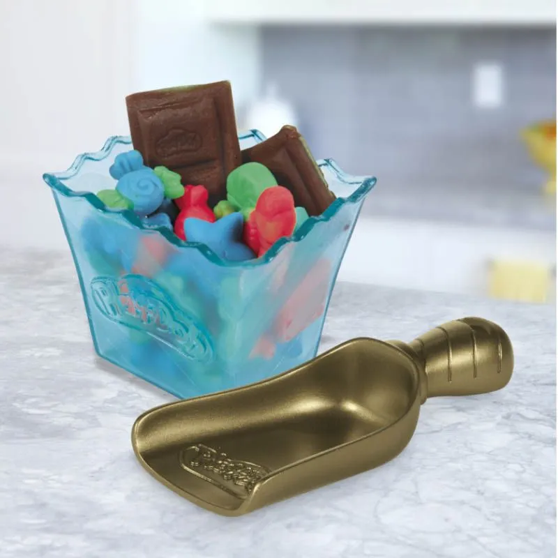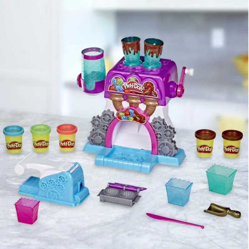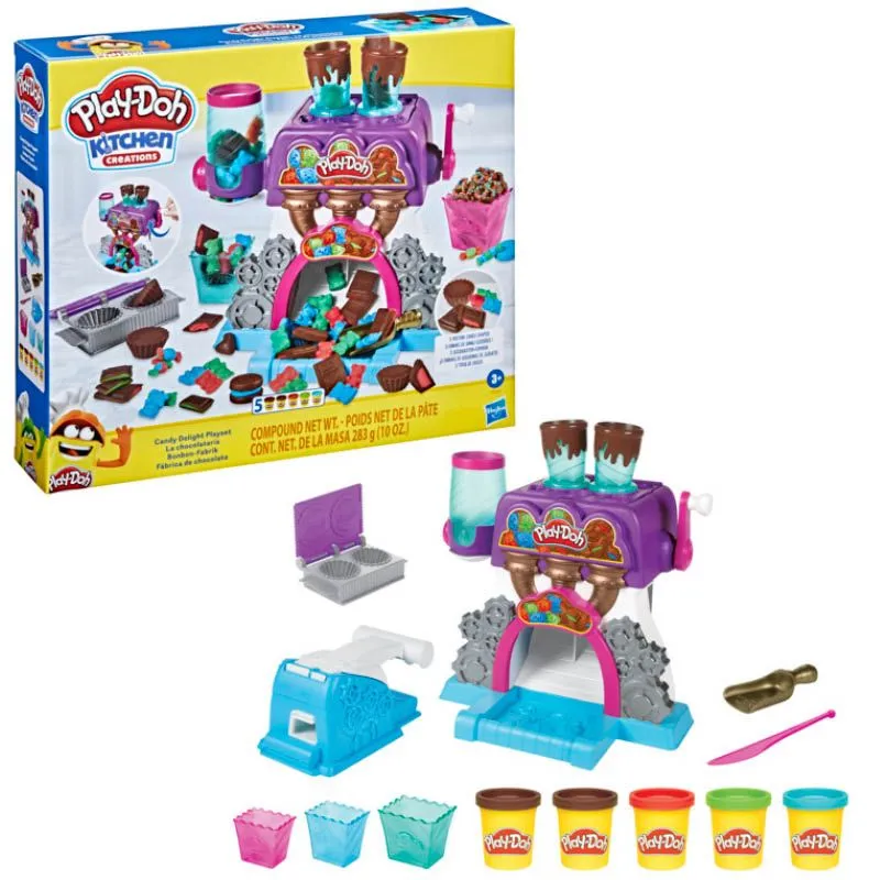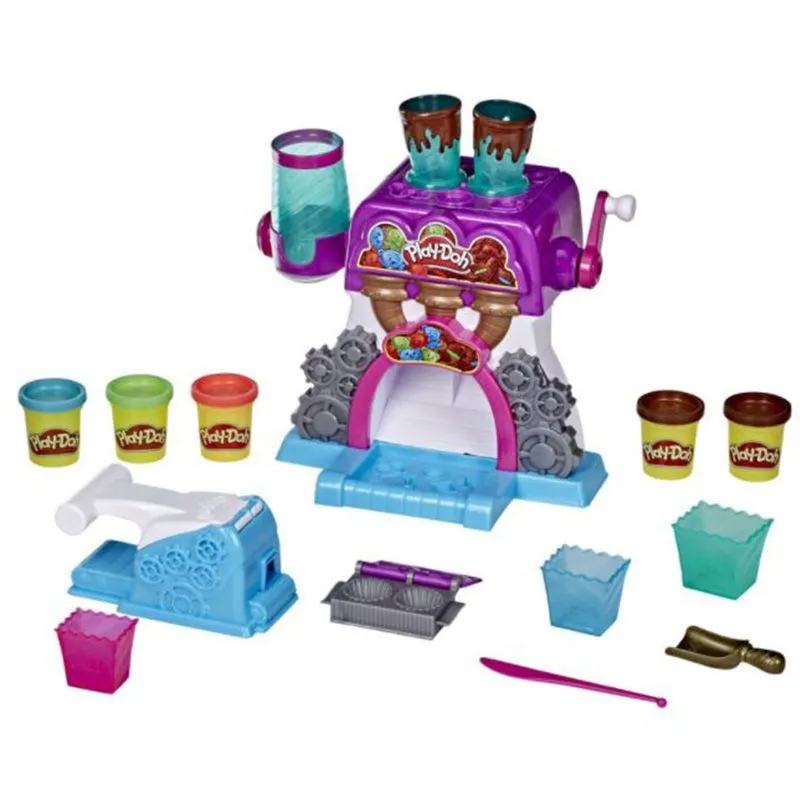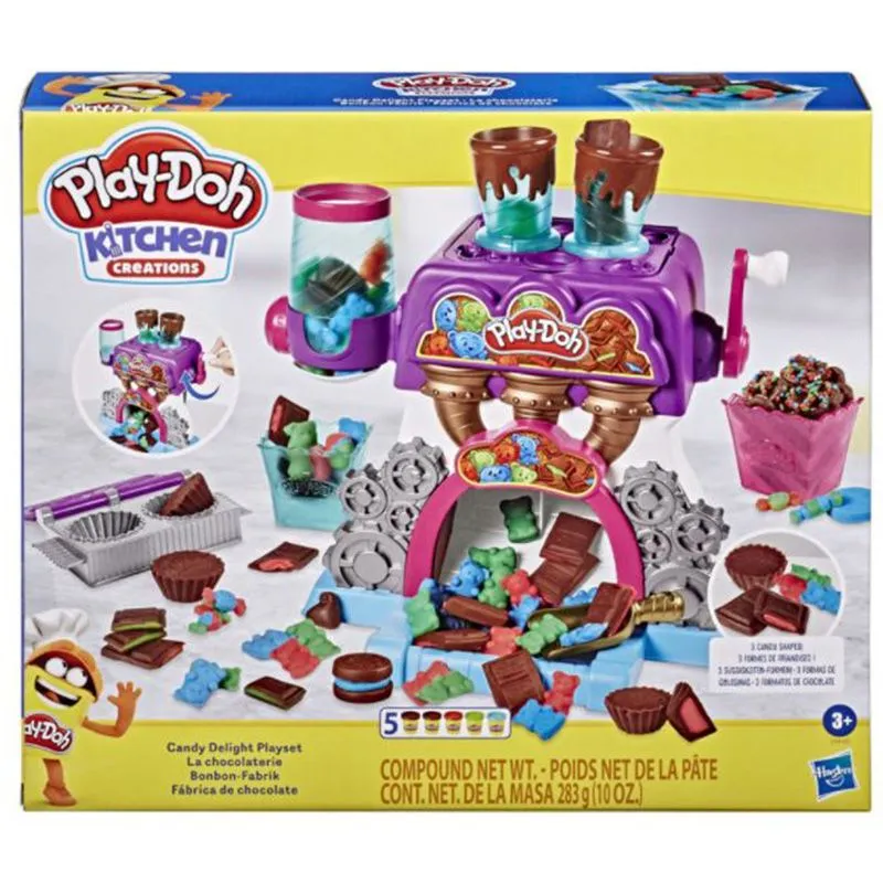 Det er godteri i massevis på godteributikken Play-Doh! Denne Play-Doh godterifabrikken er en godbit for fantasien når barna lager sine egne morsomme gummibjørner, godteribarer og godterikopper. Fyll toppen med Play-Doh-blanding, og vri deretter sveiven på godterimaskinen for å se de sprø fargerike Play-Doh-godteriene helles ut. Øs kreasjonene i de morsomme godteri-bøttene for å vise dem frem for venner og familie. 5 bokser med giftfri Play-Doh-blanding fungerer som modellering av leire for å øke kreativiteten. Det er en flott kunst- og håndverksaktivitet eller gave til barn fra 3 år og oppover!