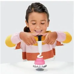 Tilsett frostig frosting med dekorasjonsverktøyet og lag fargerike Play-Doh-toppiger med halvformene. Play-Doh Kitchen Creations komfyr lekesettet leveres med en mikseskål for å lage 3 morsomme dryssformer. For mer kreativ moro har hver Play-Doh-kake et hemmelig hulrom inne for å fylle med fargerike overraskelser.