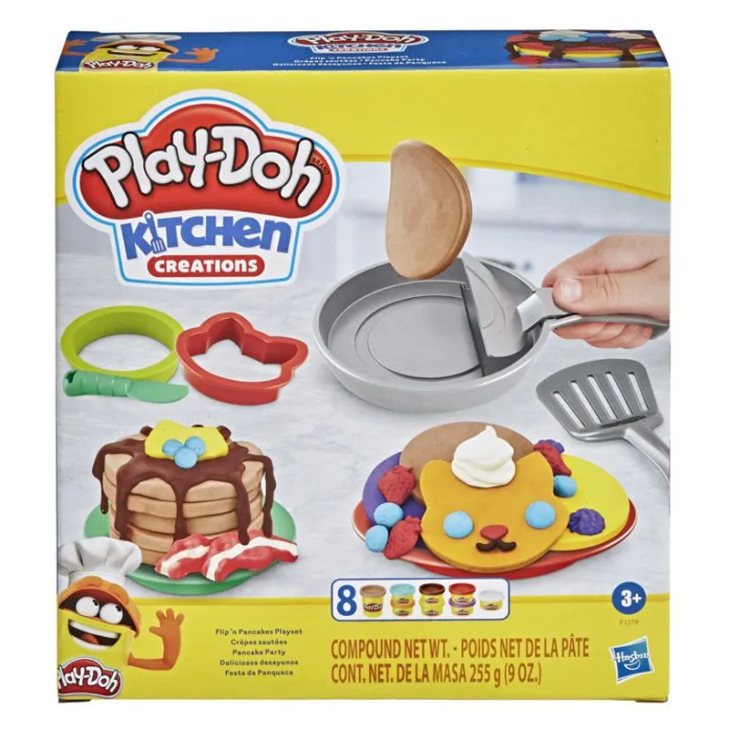 Start en pannekakefest med Play-Doh Kitchen Creations pannekake lekesett. Med den spesielle stekepannen kan de små vippe pannekaker i luften ved å trykke på en knapp! Lag fantasifulle pannekaker i 4 forskjellige former med fargerike kuttere og 8 bokser Play-Doh. Tilpass Play-Doh-pannekaker med sirup og fargerik Play-Doh-frukt. Det er så mange måter barna kan bli kreative med Play-Doh Pannekake-lekesettet.