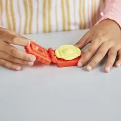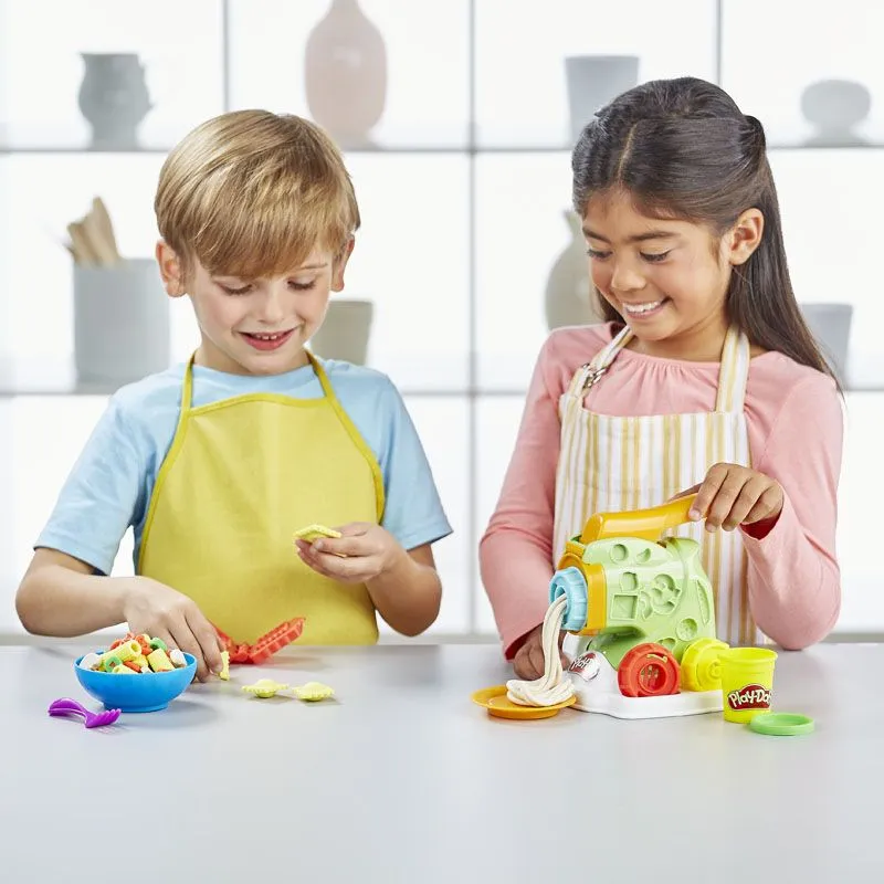 Med Play-Doh Kitchen Creations er fantasien den beste ingrediensen! Fra liksom-pasta til ramenboller i fantasien – dette nudelverktøyet kan lage alle typer deilige Play-Doh-nudelretter. Bare velg en skive for å endre formen, ha Play-Doh masse i nudelverktøyet, og trykk på håndtaket for å trykke ut masser av morsomme nudler! Sett også raviolikopier og liksom-lasagne på menyen med formen og kutteren. Det er også former for naturtro makaroni med ost og morsomt strø. Når de er klare, viser du mesterverkene av Play-Doh-nudler på tallerkenene!