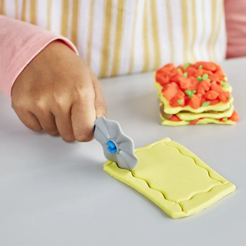 Inneholder nudelverktøy, 4 nudelskiver, raviolibokform, lasagnekutter, bolle, tallerken, kutter, kniv, rulle, gaffel og 5 bokser Play-Doh modellermasse (tot. 280g).