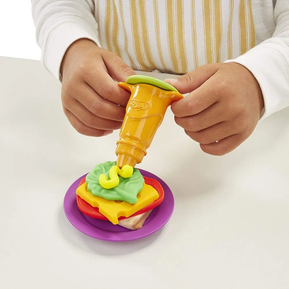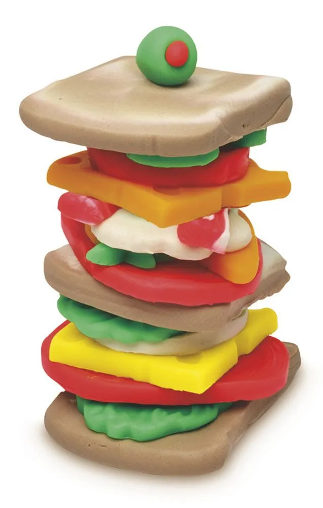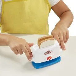 Lag de herligste forkostmåltidene med dette Play Doh lekeleire-settet. Brødristeren former leiren som skiver og formingsverktøyene former leiren til ulike pålegg. Lag din egen sandwich og server den på tallerknene som følger med. Leiren er trygg å leke med og inneholder ingen farlige stoffer, men er ikke beregnet til å spises. Inneholder hvete. Inneholder 6 bokser med leire (totalt 280g) og mye tilbehør og redskaper. Anbefalt alder fra 3 år.