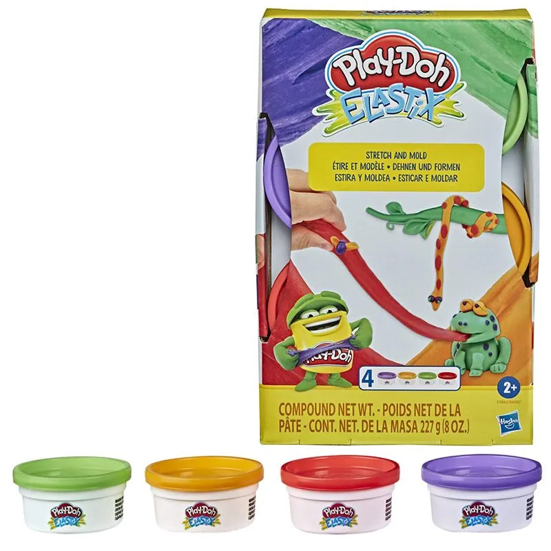 Sett med 4 Play-Doh lekeleire bokser. Lekeleiren har ekstra strekk i seg slik at du kan dra i den og lag stilige og orginale former.