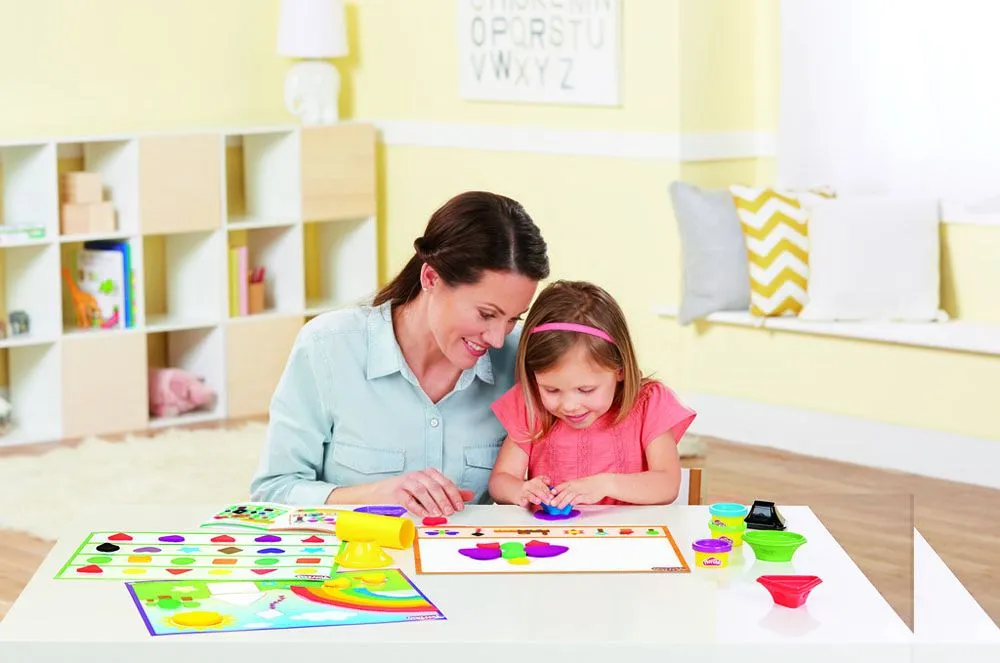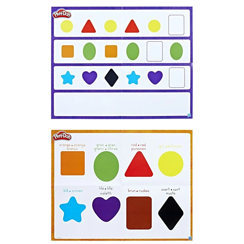 Morsomt og lærerikt leiresett fra Play Doh. Bruk de medfølgende lekemattene med maler av ulike former og figurer og forme leiren etter malen. Settet inneholder 8 bokser leire i ulike farger (totalt 224g), former og rulle, lekematte og forslag til aktiviteter for å lære om former og farger. Språket er på norsk. Anbefalt alder fra 2 år.