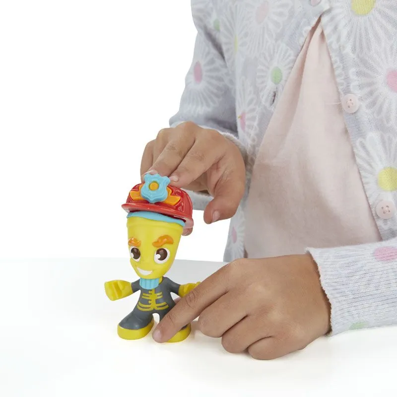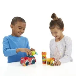 Kom til unnsetning og slukk alle brannene i byen! Sett brannmannen inn i brannbilen og kjør av gårde, og lad deretter vannkanonene og trykk en sprut Play-Doh-vann utover flammene. Snu vannkanonen rundt og forsikre deg om at alt er slukket! Brannmannen kan holde øksen og hogge seg gjennom murbrokkene, og ildformen kan plasseres på lokket til boksene og bli en del av scenen. Brannbilen passer perfekt i garasjen på brannstasjonen (selges separat). Settet inneholder figur, brannbil, tilbehør og tre bokser Play-Doh-modellermasse i standardstørrelse.
