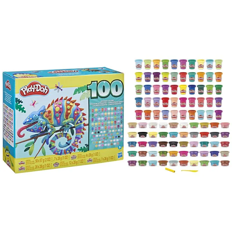 WOW! 100 bokser med 100 farger! Dette Play-Doh-settet for barn fra 3 år og oppover er perfekt for morsomme gruppeaktiveter. Denne fargekolleksjonen kommer med 57 bokser med klassisk Play-Doh-blanding, 36 bokser med Play-Doh Sparkle, Super Shimmer og Metallic Shine for å legge til litt glitter og skimmer, og 7 Play-Doh Confetti-farger for å gjøre hver kreasjon til en feiring! Dette settet er fantastisk for felles lek, kunst og håndverksaktiviteter, festfavoritter, eller goodiebag-fyllstoffer og mer. Med 100 Play-Doh-bokser er det nok til at alle kan være med på moroa!