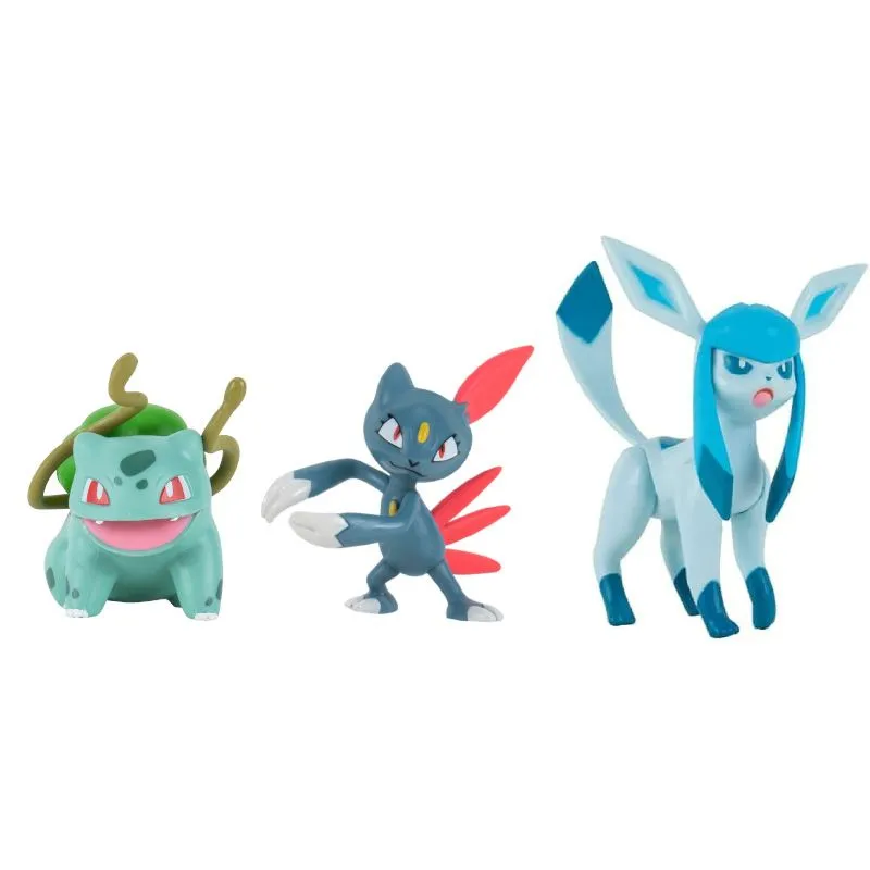 Gress-type Pokémonen Bulbasaur, Mørk/Is-type Pokémonen Sneasel, og Is-type Pokémonen Glaceon kommer med flotte detaljer og er de perfekte tilleggene til enhver Pokémon trener! Den 8 cm høye Glaceon kommer med flere artikulasjonspunkter slik at du kan possere den opp til kamp! Gjenskap dine favoritt øyeblikk fra tv-serien eller dra ut på nye spennende eventyr sammen med Bulbasaur, Sneasel, og Glaceon!