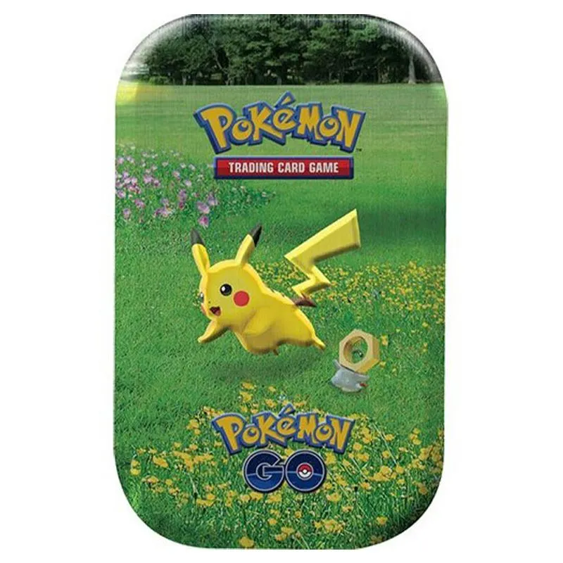 Pokemon Go Mini Tin inneholder 2 stk boosterpakker (hver booster inneholder 10 pokémonkort) en 1 stk Pokémoncoin, samt 1 stk Pokémonkort som matcher fremsiden av boksen med Picachu.