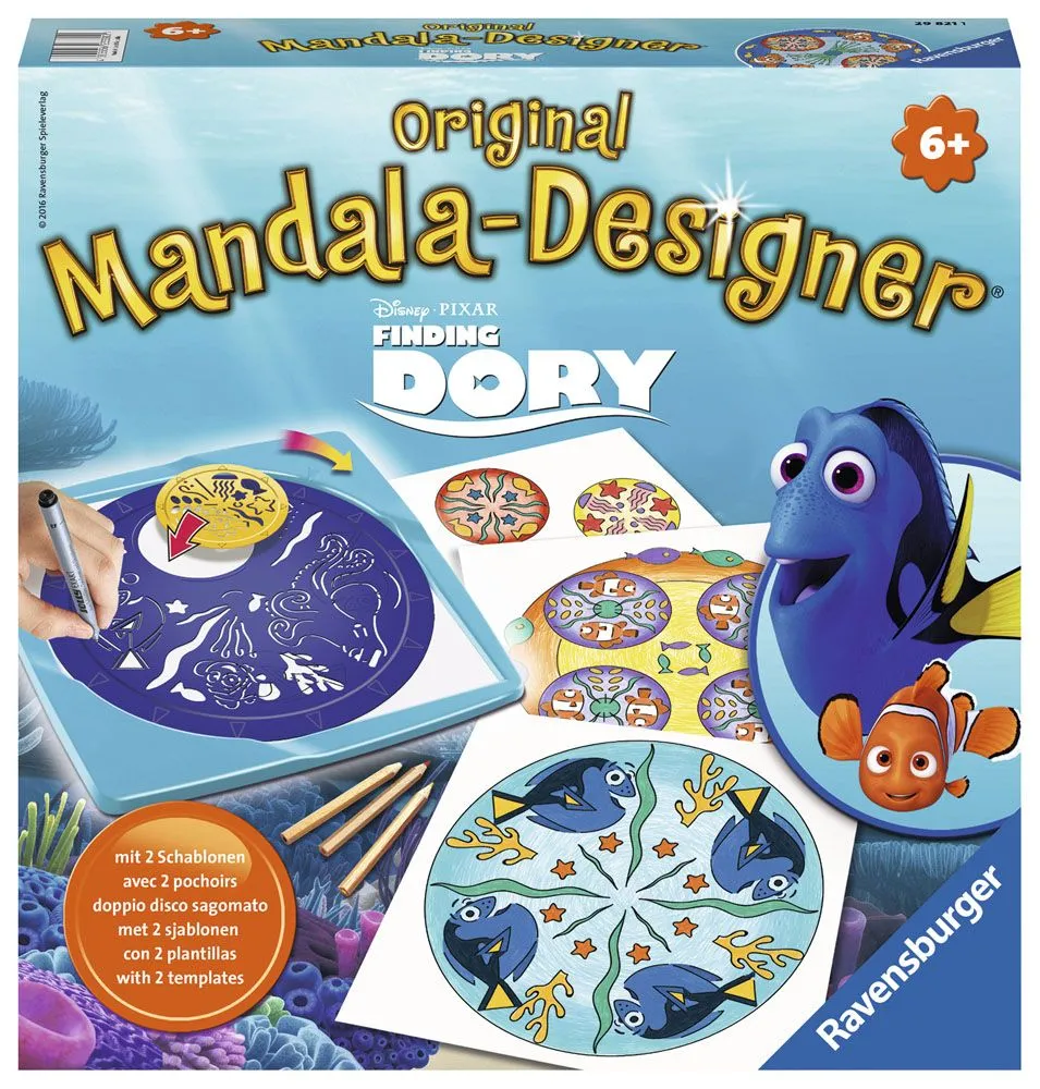 Lag dine egne mandaler med dette flotte Finding Dory mandala designer settet. Velg om du vil male mandalaer i mandalaen, små mandalaer eller klassiske mandalaer. De to sjablongene som følger med byr på utallige muligheter. Bare legg et papirark mellom tegnerammen og sjablongen og så kan du starte. Drei sjablongen videre pil for pil, avhengig av hvor ofte du vil gjenta et motiv på mandalaen din. Nå trenger du bare fargelegge den i forskjellige farger, og så er din selvlagte mandala ferdig! Anbefalt alder: 3+