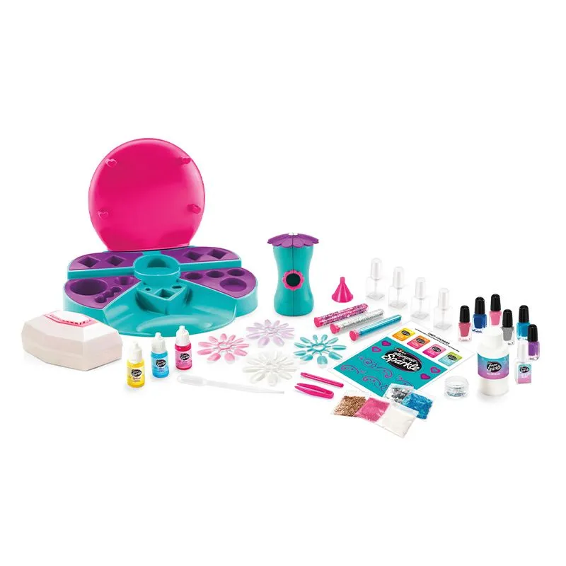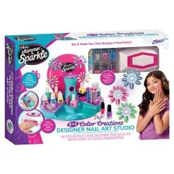 Bland og lag dine egne flotte negledesign! Dette designre neglestudioet gjør det morsomt og enkelt å blande farger for å lagge unike negledesign! Med 6 neglelakker i forskjellige farger kan du mikse og matche for å lage ekte kunstverk på neglene dine. Neglesettet inkluderer ekte salongstil negletørker slik at det er raskt å enkelt å fullføre stilen din! Glitrende detaljer, formede paljetter og mer følger med i settet! Design neglekunsten selv, eller prøv de flotte ‘Stick On’ neglene som enkelt fest på neglene dine. Det blir dobbel neglemoro med 6 trendy nyanser av neglefarge som er klare til bruk!