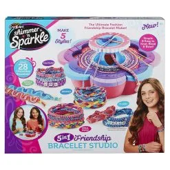 Lag flotte armbĂ„nd pĂ„ 5 forskjellige mĂ„ter med dette flotte Shimmer ‘N’ Sparkle armbĂ„nd studioet! ArmbĂ„ndene kan lages i forskjellige farger og dekoreres med pynten som fĂžlger med (bokstaver og perler). Lag armbĂ„nd til deg og dine bestevenner. ArmbĂ„nd studioet er enkelt Ă„ bruke, uten behov for Ă„ snu eller vri mens du holder pĂ„. Med egne skuffer pĂ„ undersiden av studioet er det enkelt Ă„ oppbevare alt tilbehĂžret du trenger til Ă„ lage armbĂ„nd.