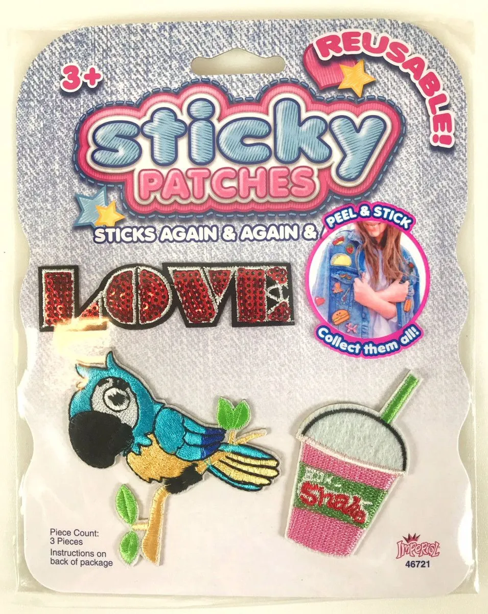 Sticky Patches er selvklebende stoffmerker til klær. Merket kan tas av og pÃ¥ og flyttes rundt flere ganger. Hver pakke kommer med 3 forskjellige figurer og det finnes 12 forskjellige pakker.Â