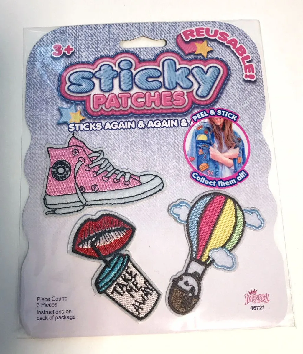 Sticky Patches er selvklebende stoffmerker til klĂŠr. Merket kan tas av og pĂ„ og flyttes rundt flere ganger. Hver pakke kommer med 3 forskjellige figurer og det finnes 12 forskjellige pakker.Â