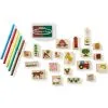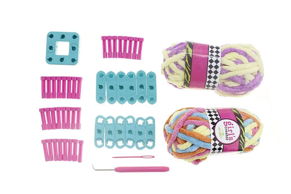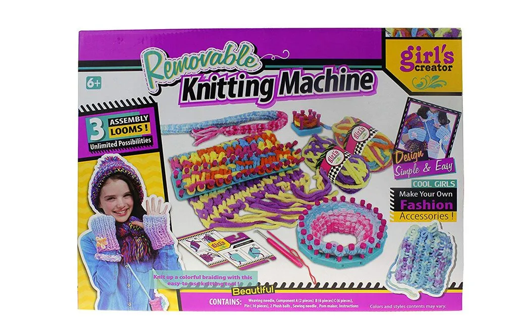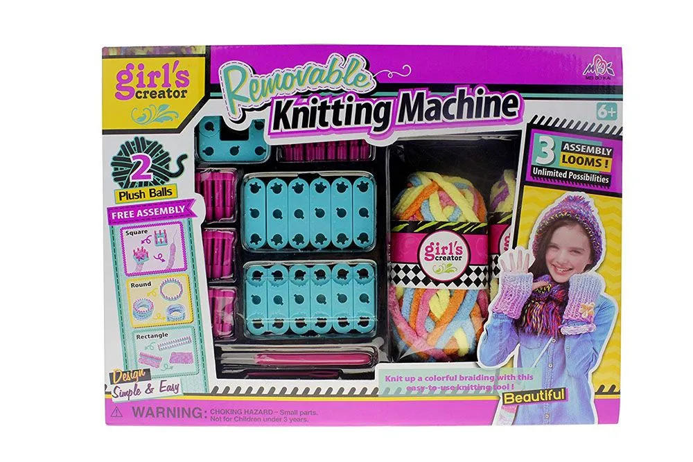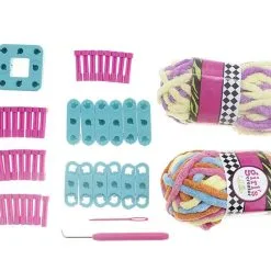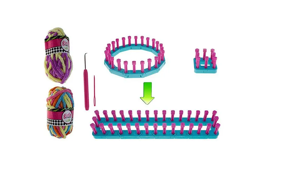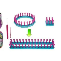 Kjekt strikkesett med 3 ulike strikkeringer som en selv bygger til slik en vil ha de. Dette gir deg mange muligheter. Du kan lage både runde, kvadratiske og rektangulære strikkeringer. Med i settet kommer og 4 nøster med tykt herlig garn, nål og strikkekrok. Passer fra 6 år+